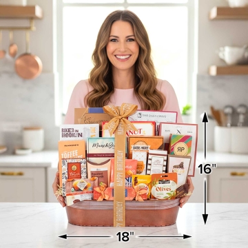 This gorgeous birthday gift basket is brimming with a scrumptious assortment of sweet, salty, and savory treats. With gourmet treats such as Dilettante Premium Chocolate Truffles, Cinnamon Yoguert Pretzel Twists, Butter Toffee Popcorn and many more delicious goodies, this gift basket is the ultimate birthday gift.