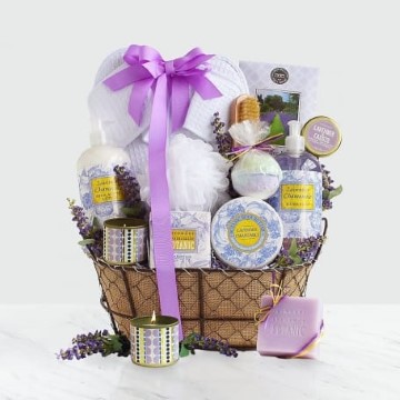 This lovely spa basket evokes fragrant fields of lavender and relaxing afternoons at the spa. A rustic wire basket holds everything needed for a perfect getaway, including lavender lotion & body buttercream, a candle, bath bombs, and a pair of slippers.