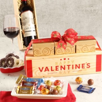 Celebrate Valentines Day with a romantic wine gift set. This classy wine gift is beautifully presented in a wooden wine box with golden gift boxes. Each gift set includes a crisp bottle of wine along with perfectly paired chocolate pretzels and gourmet treats.