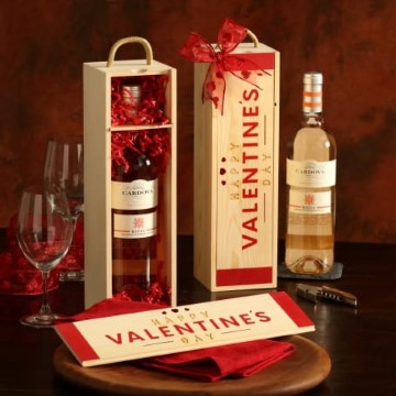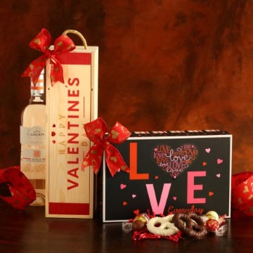 This thoughtful wine gift set is the perfect way to let him or her know how much they mean to you. This gift set includes a wooden gift box with a crisp bottle of wine and a festive gift box that is brimming with perfectly paired treats. Raise a glass of wine with your recipient as you enjoy these delicious chocolate covered pretzels, Lindt Chocolate Truffles, and other perfectly paired gourmet treats.