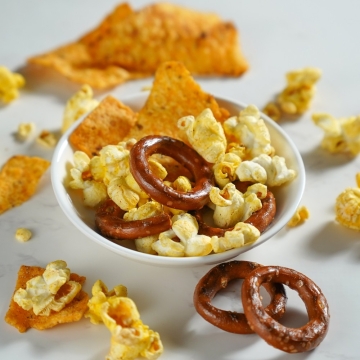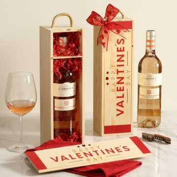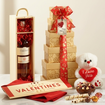 If you’d like to spoil your Valentine with a grand wine gift, the Valentines Day Delights Duo Gift Set is a perfect choice. This gift set includes a crisp bottle of wine in a stunning wooden gift box, along with a beautiful gift tower. This golden gift tower is filled to the brim with an assortment of gourmet popcorn, chocolate covered delights and many more delicious treats