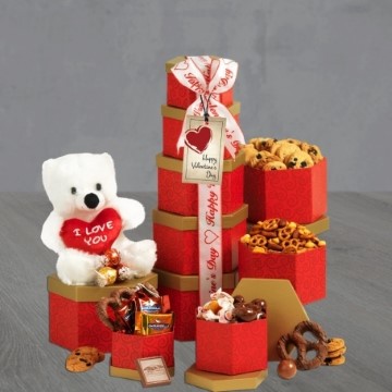 Send your love this Valentine's Day with our Valentines Day Gift Tower. It’s filled to the brim with gourmet snacks, chocolates, and sweets. It also includes a stuffed teddy bear with a red heart to express your heartfelt love for your Valentine.