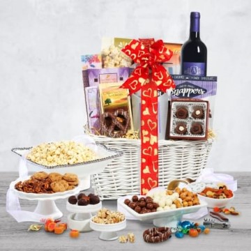Send this Valentine's Day wine basket to that special someone to let them indulge in a chocolate and wine love affair that is out of this world. Complementing the chocolates and truffles are a range of salty, savory treats like yogurt pretzels and airy popcorn.