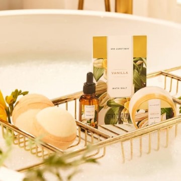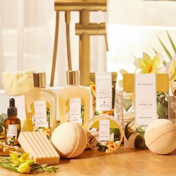 Pampering 12 Pcs Home Bath Set- Bathing with a fragrant and delightful assortment of luxury at-home spa products. Includes: Soap, Lavender Massage Oil, 2pc Bath Bombs, Shower Gel, Bubble Bath, Body Lotion, Body Scrub, Body Butter, Bath Salt, Bath Puff, Hand Cream, Dry Hair Cap, Handmade Cloth Box.