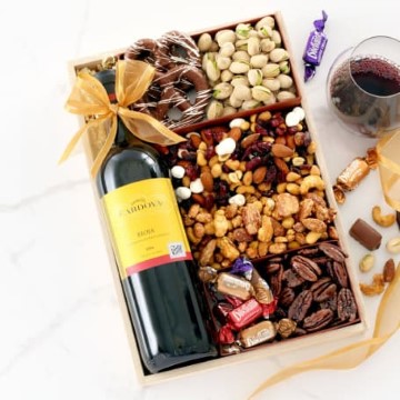 Our Very Berry Wine Gift Tray is gifted with a magnificent range of salty, sweet, and chocolatey. An array of raw, roasted, and toasted nuts are scattered throughout, from pistachios to honey baked pecans.