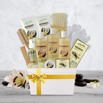 The basket is stacked to the brim with warm vanilla sugar and coconut scented products and evergreen items they'll be able to use even after the bath products have been used up. The loofa, luxury spa mitts, wooden massage stick, and other evergreen spa products make this a basket that they'll keep coming back to for months to come.