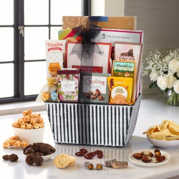 This elegant black and white gift basket comes brimming with a delicious assortment of gourmet treats. This beautifully presented assortment includes Premium Lindt Truffles, Butter Toffee Mixed Nuts, Gourmet Caramel Popcorn, and many more delicious gourmet snacks.