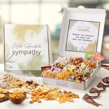 Send your deepest sympathies with a thoughtful gift box. This beautiful gift box features a sympathy design on the exterior along with a thoughtful message on the inside. Each box opens to reveal an assortment of sweet, salty, and savory gourmet treats, to let your recipient know that you are thinking of them.