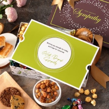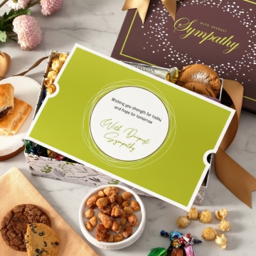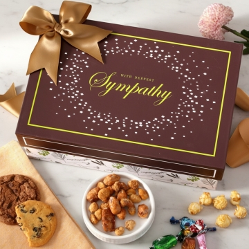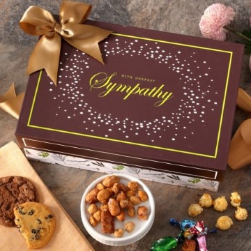 Send your heartfelt sympathy wishes with a comforting gift of gourmet treats and sweets. This beautiful gift box is filled with Gourmet Caramel Popcorn, Mint Chocolate Chip Cookies, Assorted Milk Toffees, and many more delicious treats.