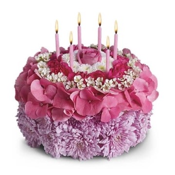Pleasing lavender cushion mums, pink hydrangea, white waxflower and button mums are sculpted into a round "cake" that's topped with six birthday candles.